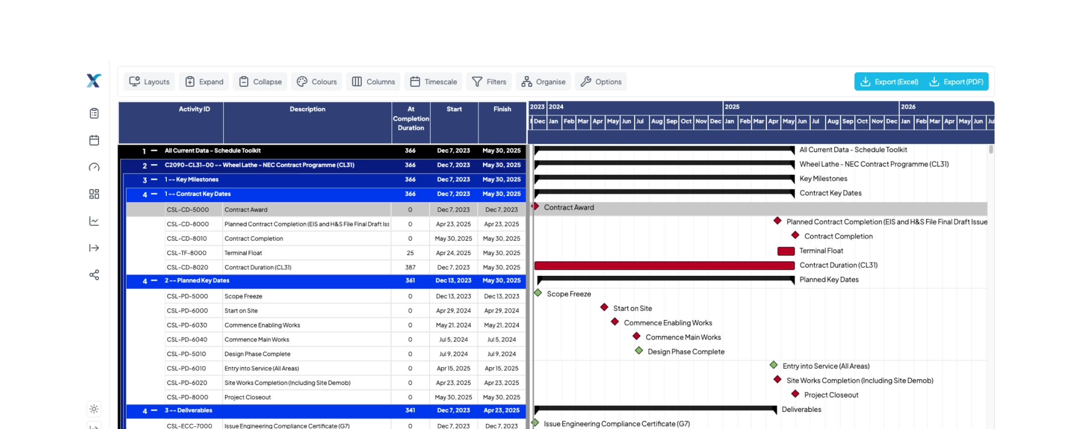Tailored timescales provide improved timeline visualisation, helping you clearly identify overlapping activities, dependencies, and critical paths. This focused view also supports better resource management, allowing for more effective allocation and utilisation while preventing potential bottlenecks.